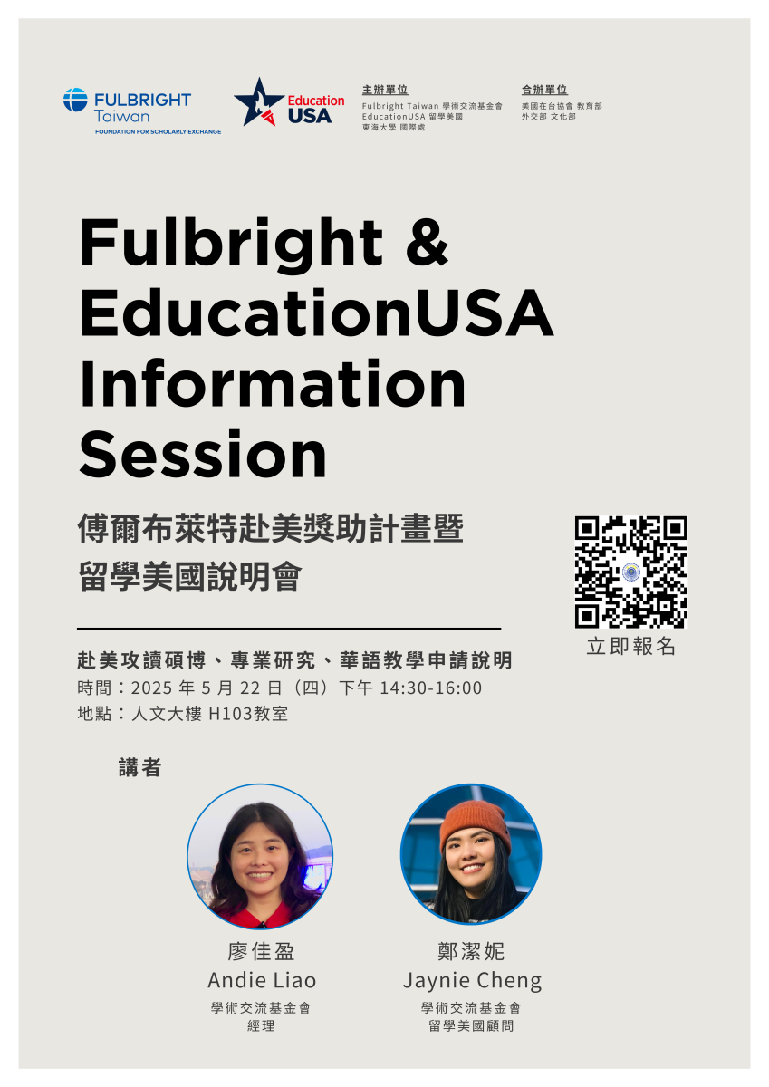 傅爾布萊特學術交流基金會經理 廖佳盈 及留學美國顧問 鄭潔妮 將親臨東海,分享申請策略與成功經驗,並詳細說明各項獎助學金計畫及申請流程。