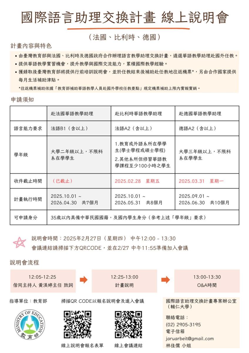 由教育部委託輔仁大學辦理國際語言助理交換計畫線上說明會,歡迎本校有意願赴法國、比利時、德國等三國擔任華語教學助理的學生可踴躍報名上線聆聽!
